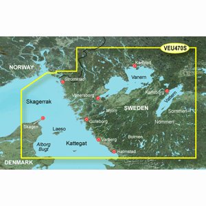Garmin VEU470S - Stromstad to Halmstad - SD Card - VEU470S Covers: Detailed coverage of lakes Vänern, Vättern Mjörn, Sommen and Exempt: Bolmen, as well as the coast of Sweden in Halmstad Stromstad. Also includes coverage of the Danish coast from Hirtshals through Alborg Bugt. Includes detailed coverage Gteborg, Vanersborg, Karlstad and Karl Borg, Swe. Frederikshavn, Denmark. And Laeso. Includes coverage of the Skagerrak and Kattegat waters., Garmin VEU470S - Stromstad to Halmstad - SD Card.